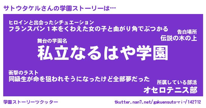 | ヒーロー風カッコイイあだ名 | 『スーパーサトウタケル』『炎刃騎士サト』 |