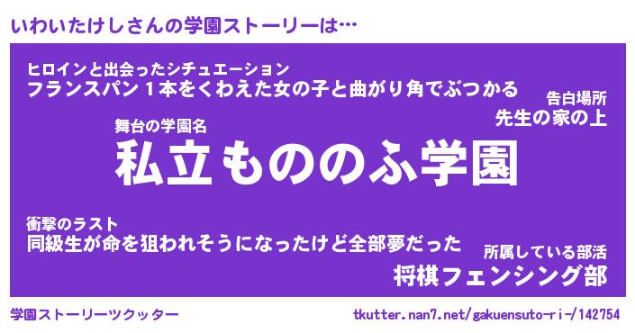 | 女子向けラノベタイトル風あだ名 | 『(仮)いわいたけしのやんごとなき事情』 |