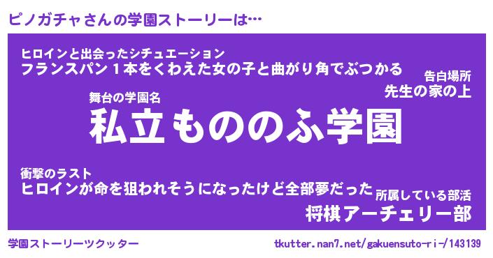 | 男性向けラノベタイトル風あだ名 | 『ピノガチャの憂鬱』 |