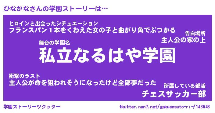 | 伝説のあだ名 | 『伝説のスナイパーひなかな』 |