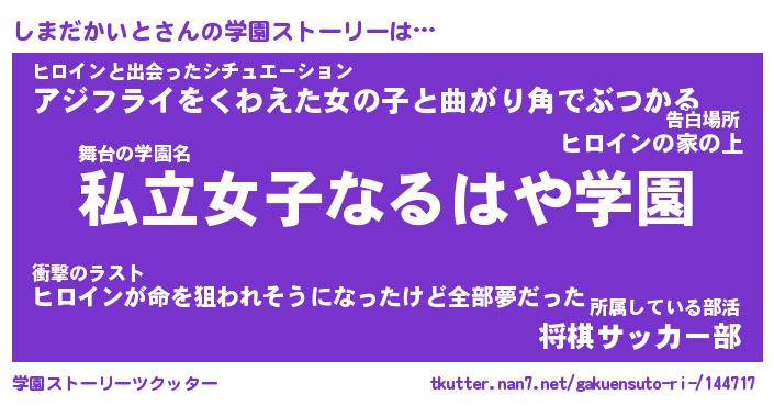 | 女子向けラノベタイトル風あだ名 | 『しまだかいと姫と円卓の騎士』 |