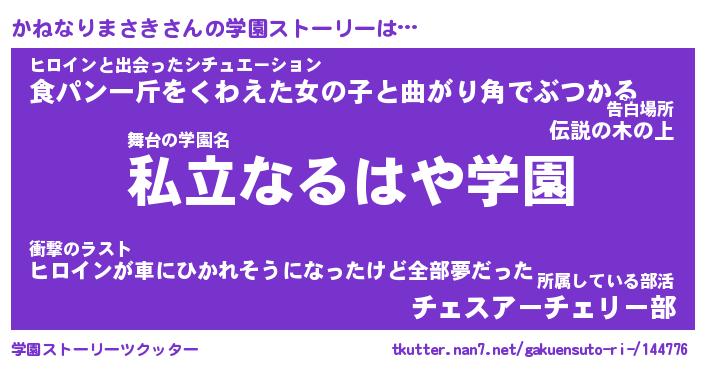 | 女子向けラノベタイトル風あだ名 | 『(仮)かねなりまさきのやんごとなき事情』 |