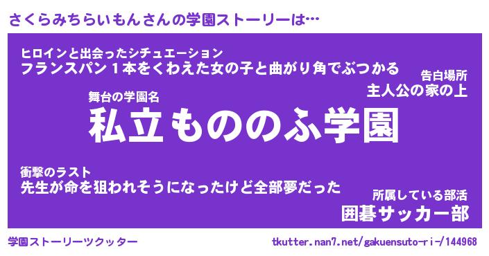 | 胡散臭い通販商品みたいなあだ名 | 『必ず成功するブレスレット…その名も「さくらみちらいもん」』 |