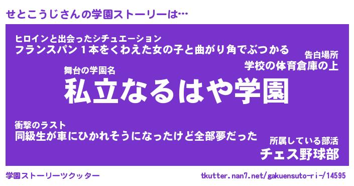 | 女子向けラノベタイトル風あだ名 | 『(仮)せとこうじのやんごとなき事情』 |