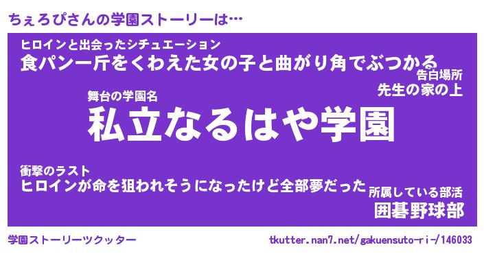 | 伝説のあだ名 | 『伝説のスナイパーちぇろぴ』 |