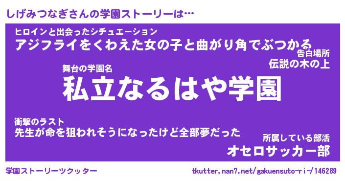 | 男性向けラノベタイトル風あだ名 | 『しげみつなぎの憂鬱』 |