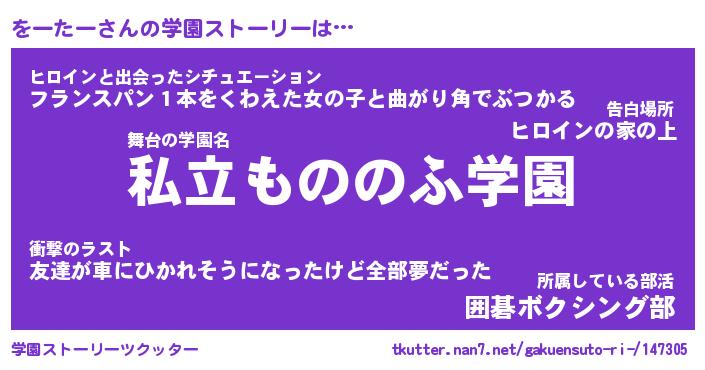 | 男性向けラノベタイトル風あだ名 | 『をーたーの憂鬱』 |