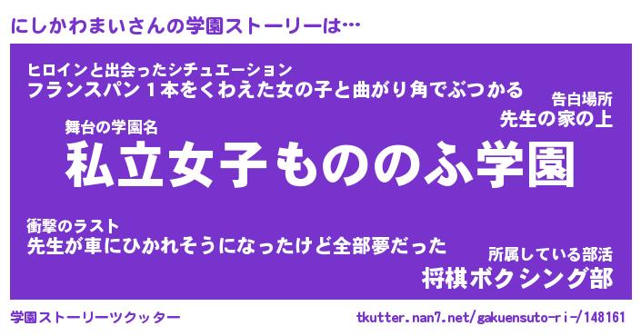 | 女子向けラノベタイトル風あだ名 | 『誰かこのにしかわまいを説明してください! ~契約から始まるウェディング~』 |