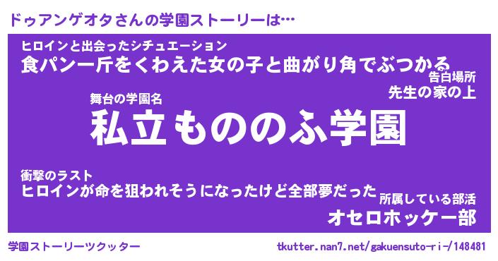 | 男性向けラノベタイトル風あだ名 | 『ドゥアンゲオタの憂鬱』 |