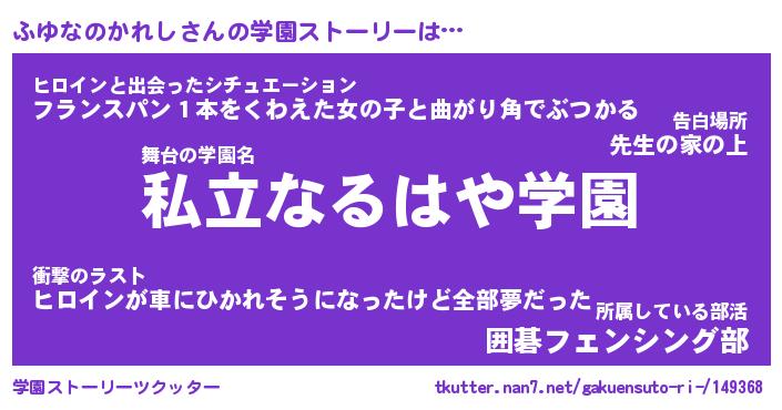 | 伝説のあだ名 | 『不死鳥のスナイパーふゆなのかれし』 |