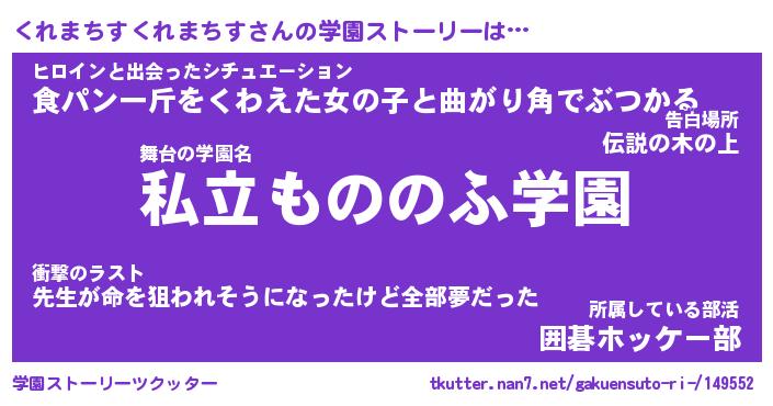 | 男性向けラノベタイトル風あだ名 | 『くれまちすくれまちすの憂鬱』 |