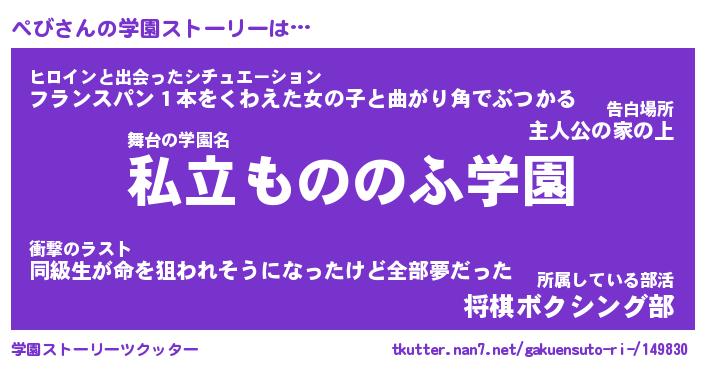 | 男性向けラノベタイトル風あだ名 | 『ぺびの憂鬱』 |