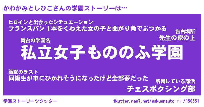 | 先生 | かわかみとしひこ先生が勤める学校名『区立もふもふ高校』 |