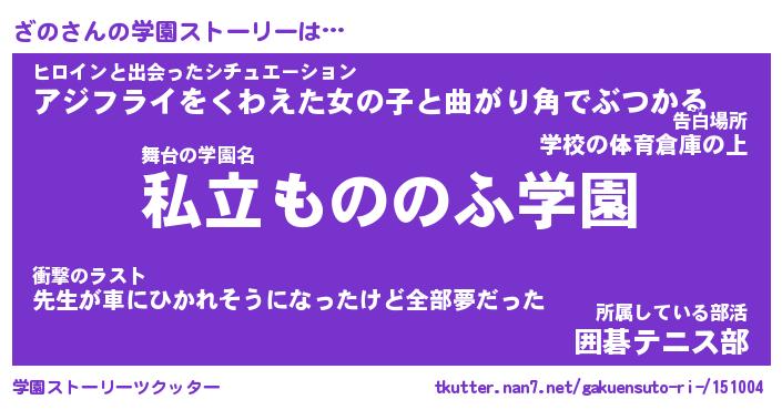 | 男性向けラノベタイトル風あだ名 | 『ざのの憂鬱』 |