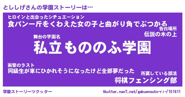 | 男性向けラノベタイトル風あだ名 | 『とししげの憂鬱』 |