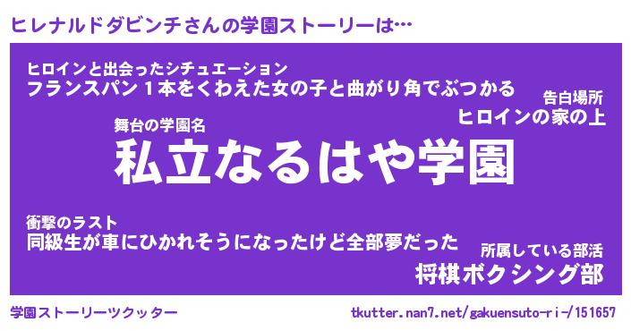 | 女子向けラノベタイトル風あだ名 | 『(仮)ヒレナルドダビンチのやんごとなき事情』 |