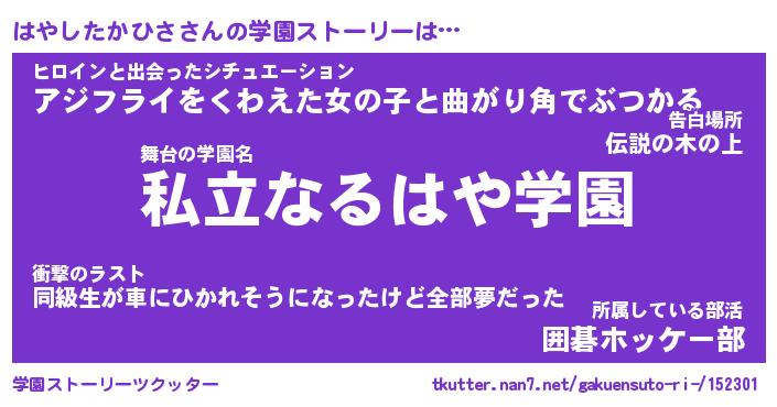 | 肩書あだ名 | 『はやしたかひさ御曹司』 |