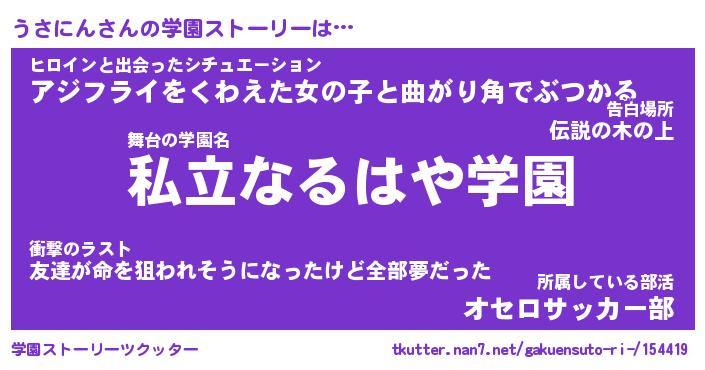 | 伝説のあだ名 | 『伝説のスナイパーうさにん』 |