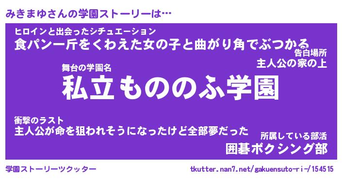 | 女子向けラノベタイトル風あだ名 | 『(仮)みきまゆのやんごとなき事情』 |