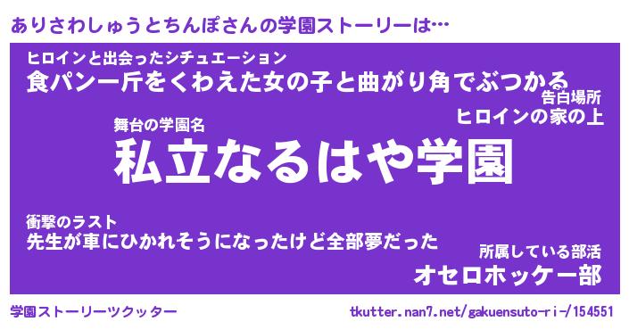 | 女子向けラノベタイトル風あだ名 | 『ありさわしゅうとちんぽ姫と円卓の騎士』 |