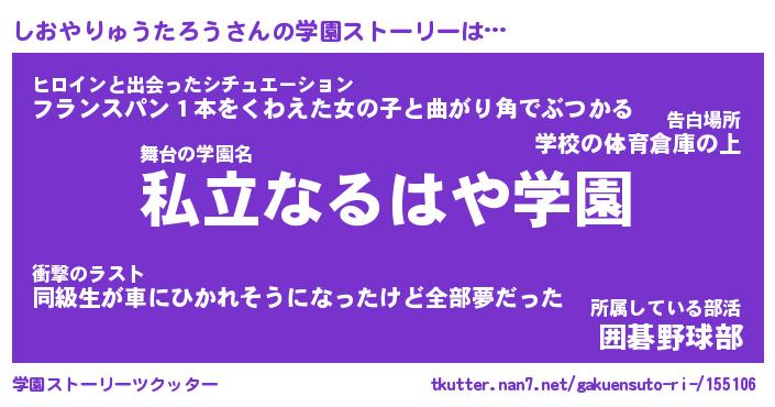 | 肩書あだ名 | 『しおやりゅうたろう御曹司』 |