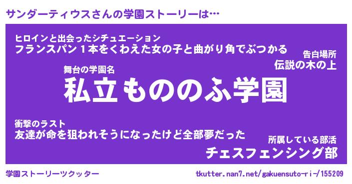 | 女子向けラノベタイトル風あだ名 | 『(仮)サンダーティウスのやんごとなき事情』 |