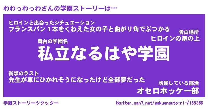 | 女子向けラノベタイトル風あだ名 | 『(仮)わわっわっわのやんごとなき事情』 |