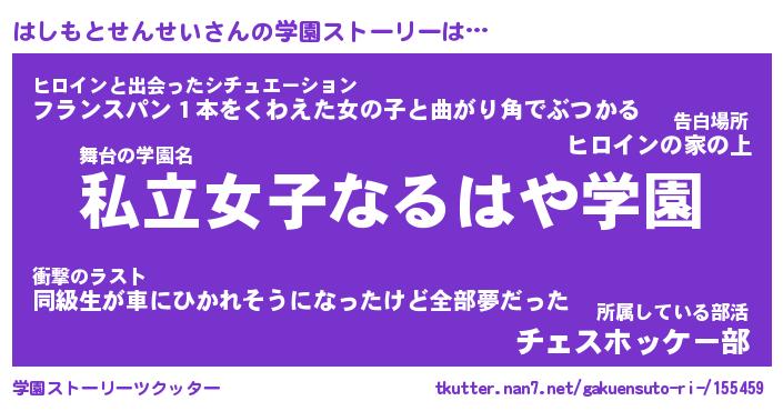 | 女子向けラノベタイトル風あだ名 | 『誰かこのはしもとせんせいを説明してください! ~契約から始まるウェディング~』 |