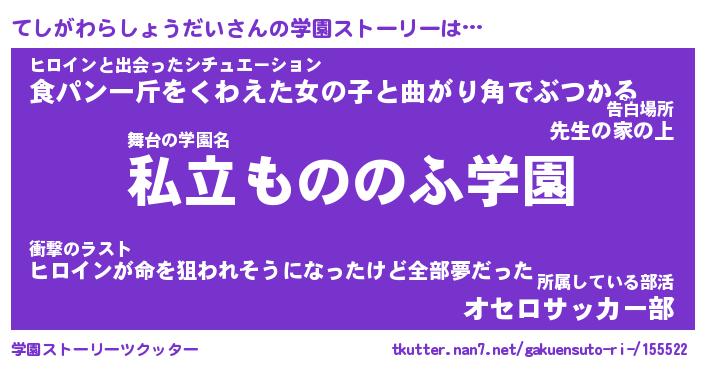 | 男性向けラノベタイトル風あだ名 | 『てしがわらしょうだいの憂鬱』 |