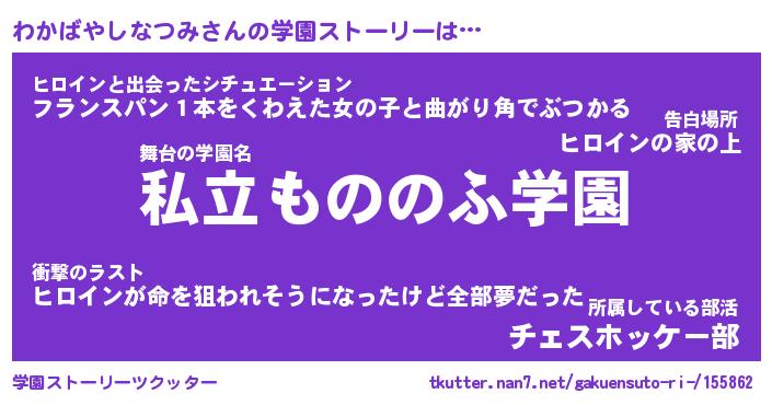 | 男性向けラノベタイトル風あだ名 | 『わかばやしなつみの憂鬱』 |