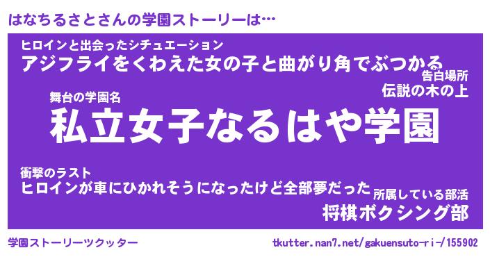 | 男性向けラノベタイトル風あだ名 | 『ハナチルサトアートオンライン』 |