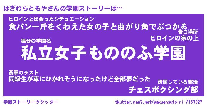 | 女子向けラノベタイトル風あだ名 | 『誰かこのはぎわらともやを説明してください! ~契約から始まるウェディング~』 |