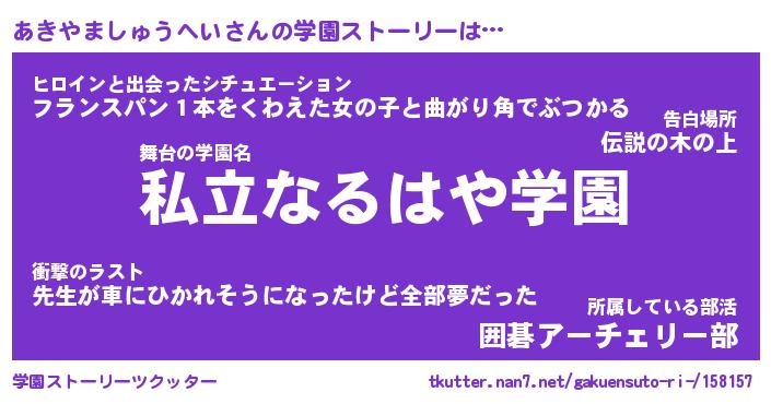 | 伝説のあだ名 | 『伝説のスナイパーあきやましゅうへい』 |