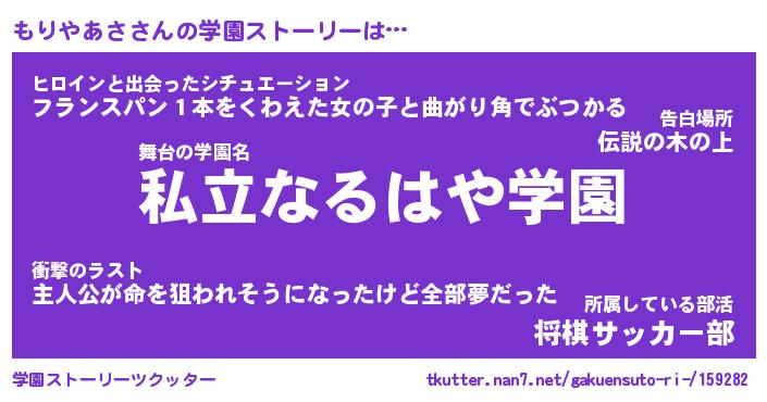 | 肩書あだ名 | 『もりやあさ店長』『もりやあさ総理大臣』 |