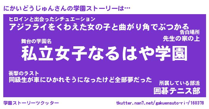 | 女子向けラノベタイトル風あだ名 | 『誰かこのにかいどうじゅんを説明してください! ~契約から始まるウェディング~』 |