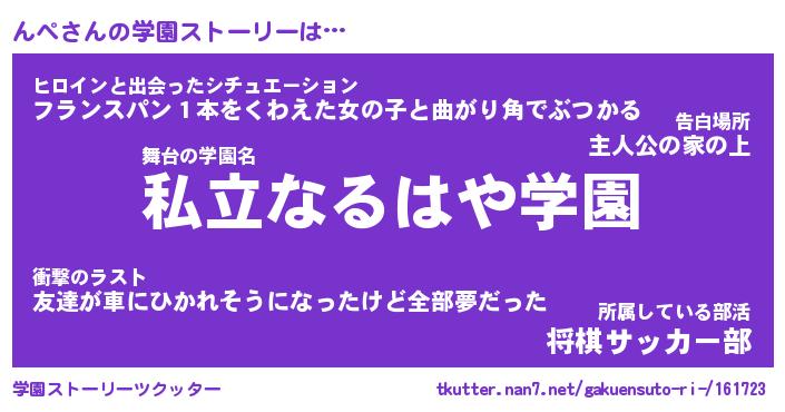 | 男性向けラノベタイトル風あだ名 | 『んぺの憂鬱』『ノーゲーム・ノーンペ』 |