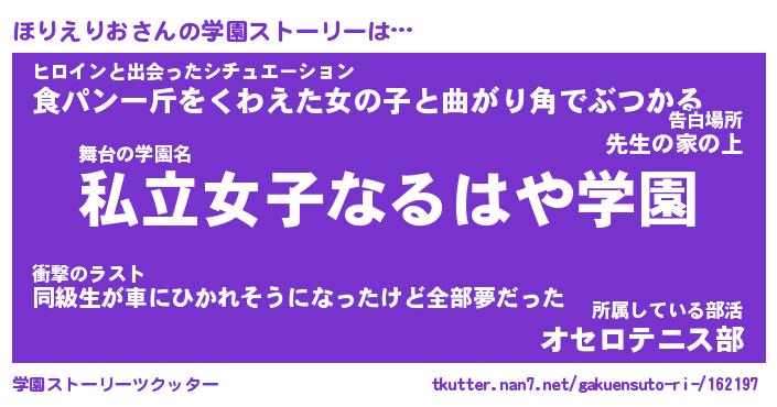 | 肩書あだ名 | 『ほりえりお社長令嬢』『ほりえりお班長』 |