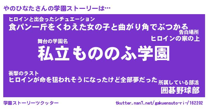 | 男性向けラノベタイトル風あだ名 | 『やのひなたの憂鬱』 |