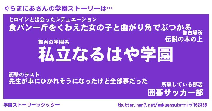 | 女子向けラノベタイトル風あだ名 | 『(仮)ぐらまにあのやんごとなき事情』 |