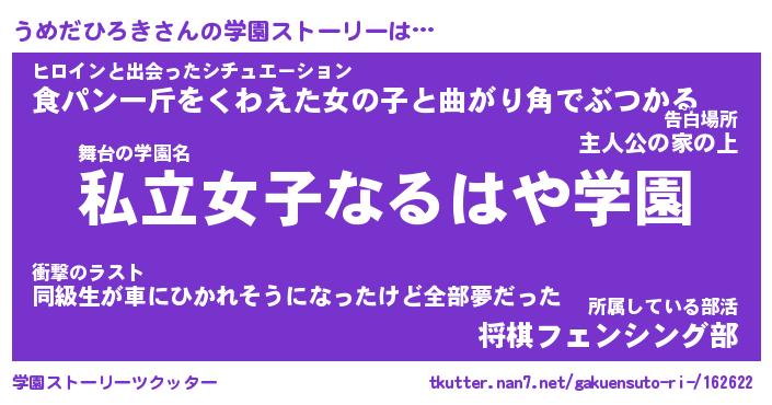 | 女子向けラノベタイトル風あだ名 | 『誰かこのうめだひろきを説明してください! ~契約から始まるウェディング~』 |