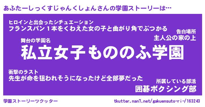 | ヘコむあだ名 | 『あふにー』『豆乳』『あふお』 |