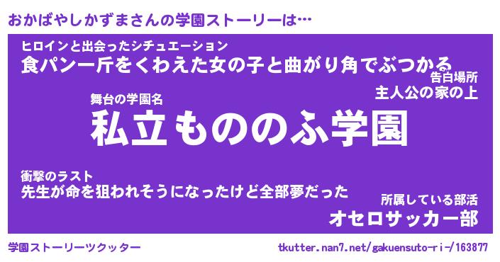 | 女子向けラノベタイトル風あだ名 | 『(仮)おかばやしかずまのやんごとなき事情』 |