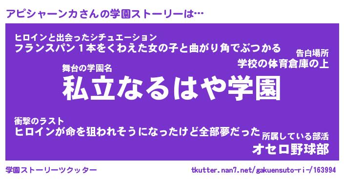 | 女子向けラノベタイトル風あだ名 | 『(仮)アピシャーンカのやんごとなき事情』 |