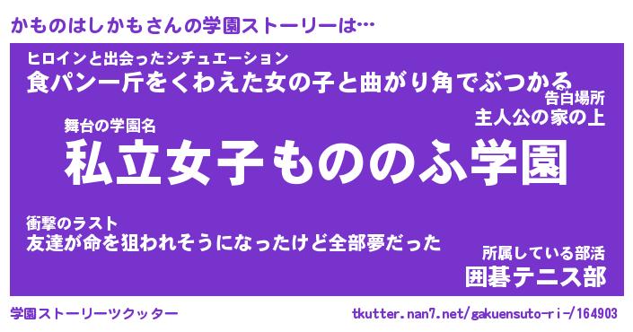 | 女子向けラノベタイトル風あだ名 | 『誰かこのかものはしかもを説明してください! ~契約から始まるウェディング~』 |
