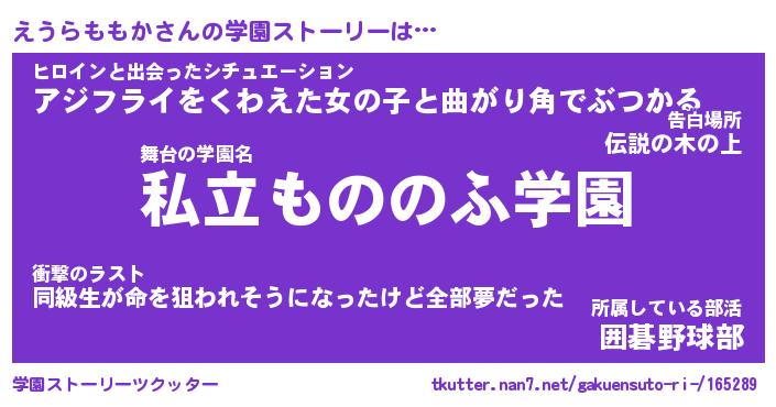 | 女子向けラノベタイトル風あだ名 | 『(仮)えうらももかのやんごとなき事情』 |