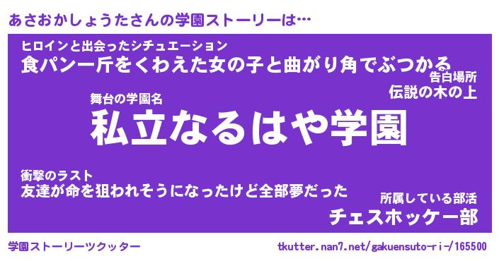 | 女子向けラノベタイトル風あだ名 | 『(仮)あさおかしょうたのやんごとなき事情』 |