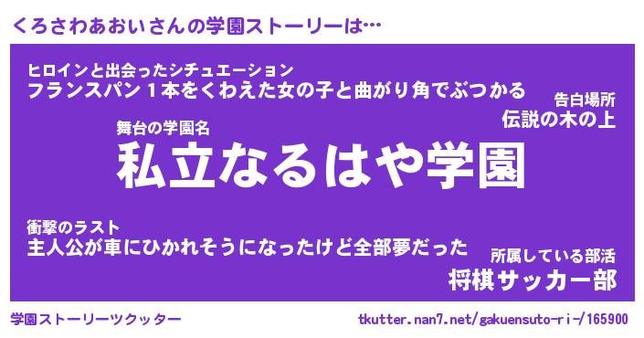 | 伝説のあだ名 | 『伝説のスナイパーくろさわあおい』 |