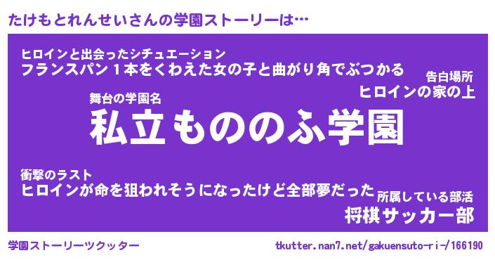 | 男性向けラノベタイトル風あだ名 | 『たけもとれんせいの憂鬱』 |
