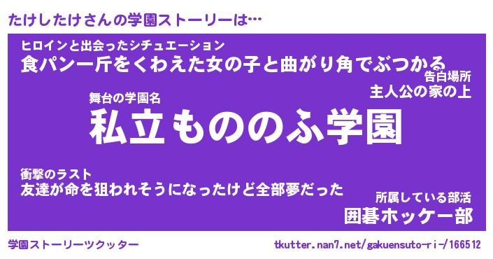| ファンタジー風あだ名 | 『タケフェル』『エターナルタケシタケー』 |