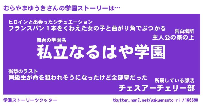 | 女子向けラノベタイトル風あだ名 | 『(仮)むらやまゆうきのやんごとなき事情』 |